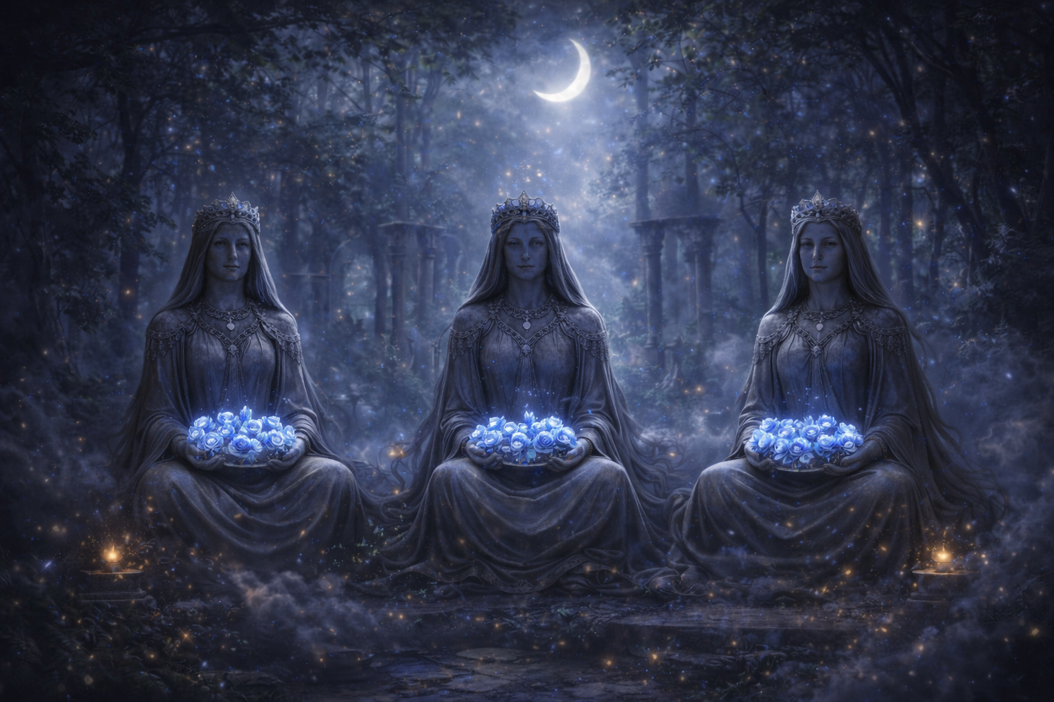 - Lunini kipi starodavnih kraljic oživijo – vsak kip nežno dvigne eno tvoje breme. Morda neviden občutek, morda tišina, ki te je omejevala. Ko odhajajo, čutiš, da je tvoje telo lažje, srce bolj pretočno, dih svobodnejši.
