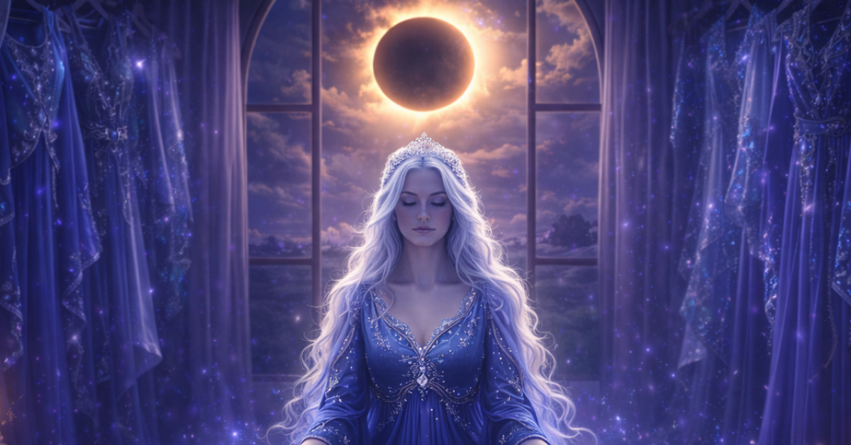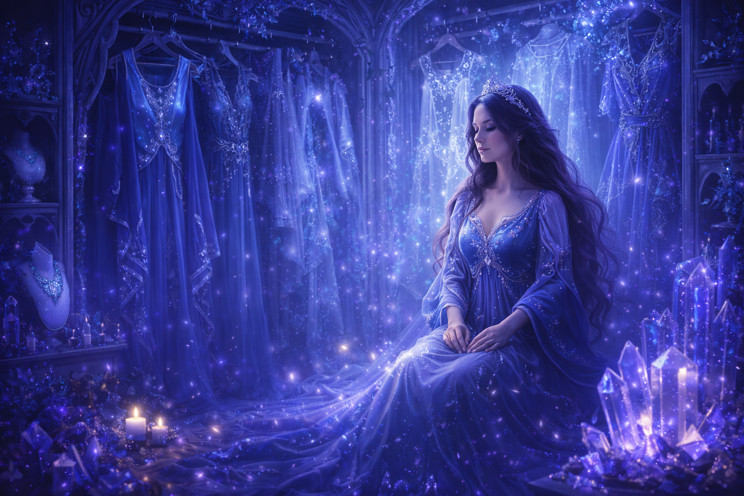 Pred tabo so odprti čarobni predali, nevidni obešalniki, lebdeče tkanine svetlobe. Vsak kos, ki ga izbereš, ni modni dodatek – temveč program tvojega novega utelešenja.