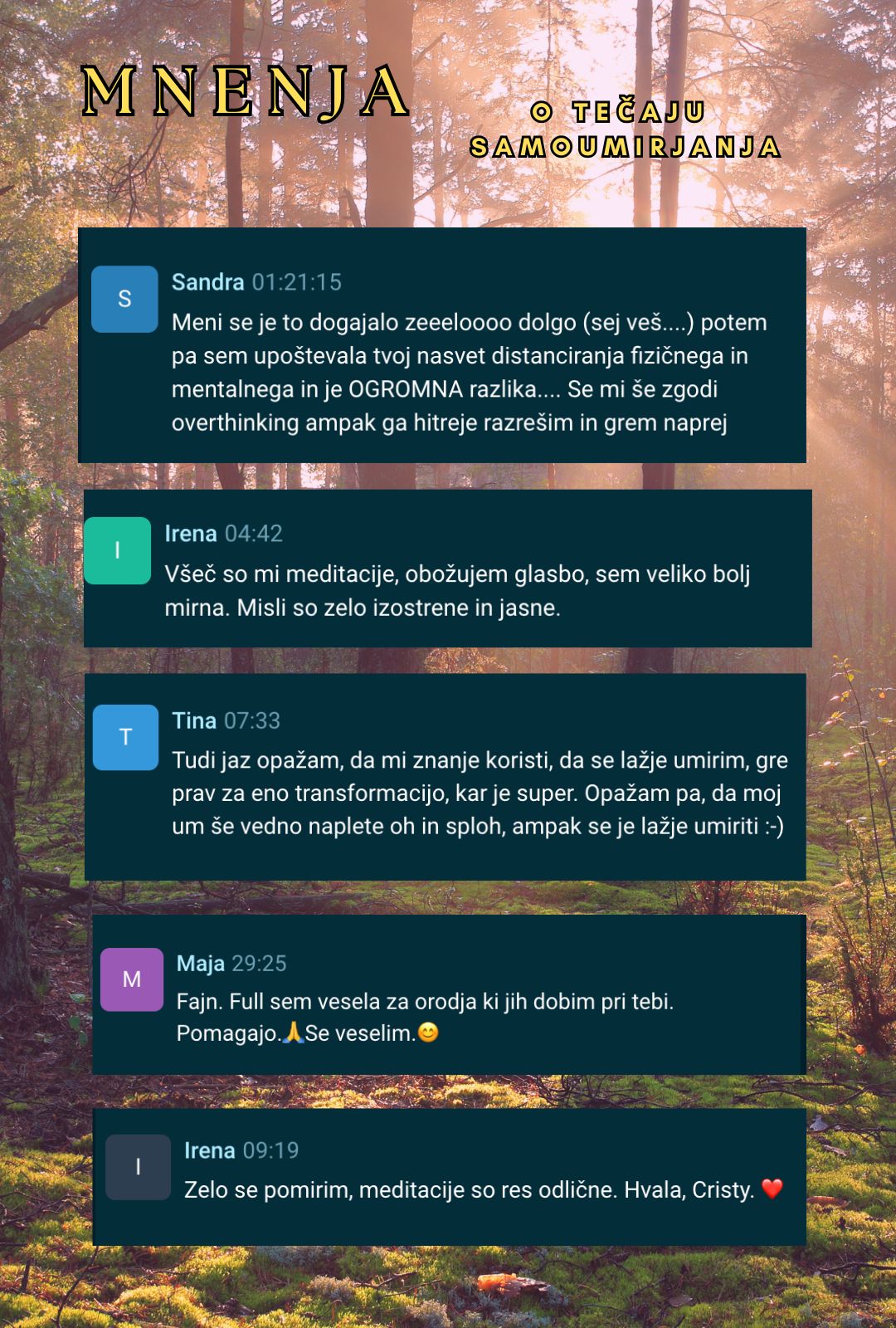 - Kako umiriti druge ljudi s pomočjo meditacije (čudovito znanje, če želiš voditi meditacije ali si že meditacijski učitelj, učiteljica)?